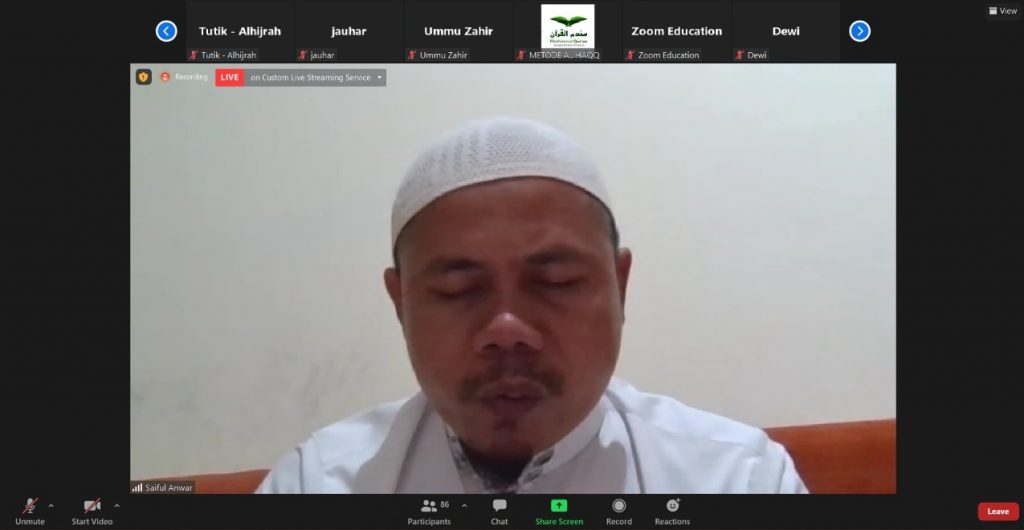 Acara yang dilaksanakan melalui Zoom Meeting ini dibuka oleh Ustadzah Nur Fasikhah selaku Pembina Yayasan Al Haqq Indonesia dan dilanjutkan dengan Tausyiah dari Ustadz Saiful Anwar Lc,MA.