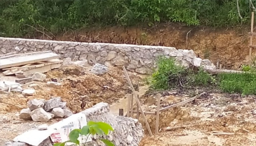 Pekerjaan pasangan Batu gunung dalam hal ini yg belum terselesaikan adalah 10,5 meter (area Pohon Ulin), rencana akan di selesaikan bersamaan dengan perapian badan jalan dengan Alat berat.